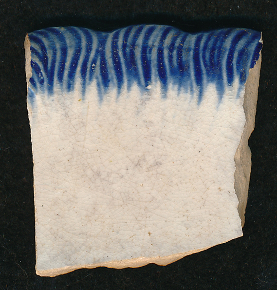 Even scallop with wavy lines. The rim is regularly scalloped rather than undulating (think repeating arcs) and sometimes has intermittent molded “buds” as seen in Examples B and C. The wavy, engraved lines descending down from the edge complete the shell motif. Found primarily on pearlware, sometimes on early whiteware.