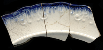 Undulating, elongated scallop with typical shell edge molded decoration. This decoration also includes molded forms similar to feather edge, with scroll-like elements extending into the body. Paired, mirror-image scrolls are separated by a spearhead or chicken-foot design. Sets of paired scrolls are separated by medallion-like elements above a diamond shape. The medallion occurs at the rise in the scalloped edge, while the spearhead occurs at the dip in the scalloped edge. Blue painted edge occurs only to the end of the traditional shell edge wavy lines.