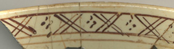 Repeating double-lined Xs with dot decoration in the interstices characterize this band. Groups of four dots in a diamond pattern fill the open diamond-shaped space. It is banded by a single line at the top and a double line at the bottom.