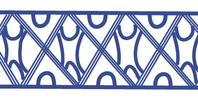 The blurry effect in this example is the result of the paint running. Triple lined X’s create a single trellis row. Curved four-sided shapes are painted in the center of each X and half circles are painted at the top and bottom of the band, in between the X’s.