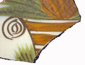 This stylistic element should be used for describing images of ceramic vessels on ceramics, which should be identified by vessel style and decoration. As this example shows, this is a ceramic vessel holding a pineapple. This stylistic element is not only seen on polychrome painted pearlwares but also on wares such as Black Basalt.