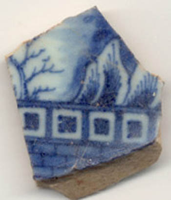Wall elements are most often seen on Chinoiserie style Chinese porcelains. They were often painted around houses. This example depicts a masonry wall with either larger masonry pieces or windows along the top of the wall.